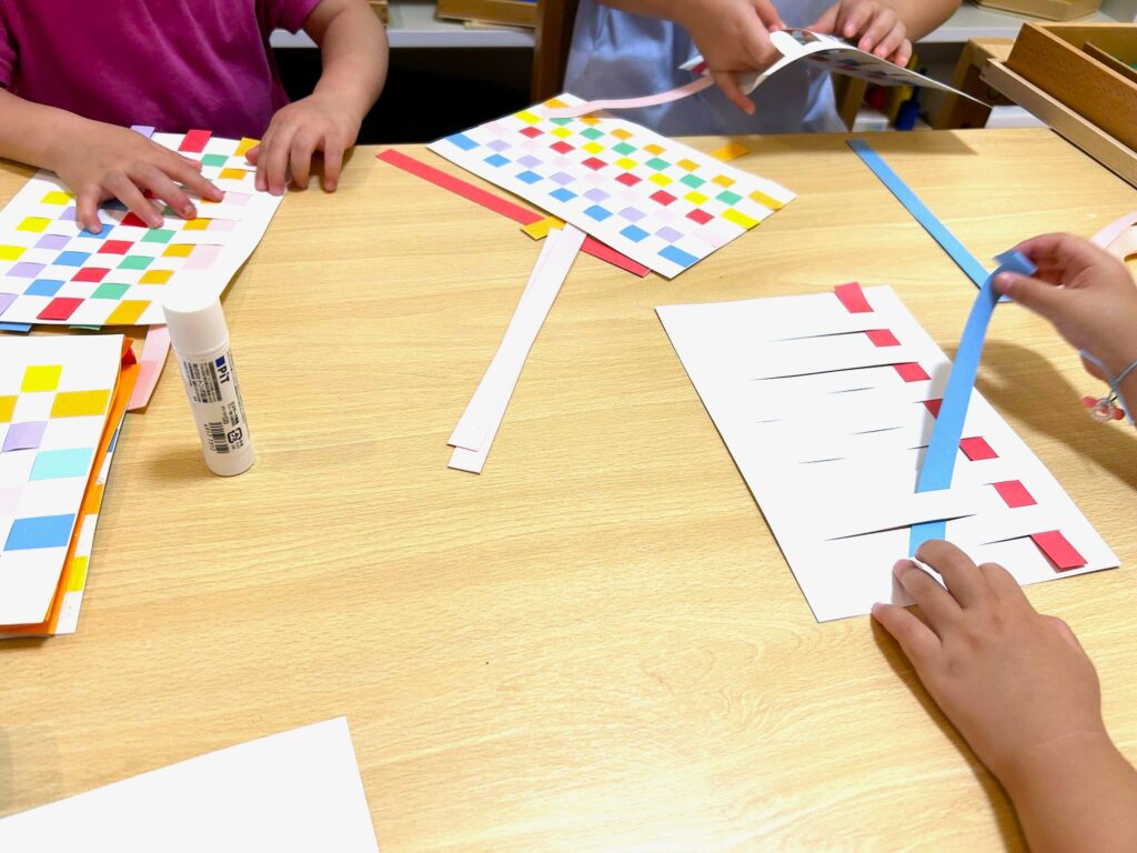 モンテッソーリ教育で使う教具にも、手先を使うものがたくさんあります。1歳2歳のお子さまでも、「切る」「あけうつす」「貼る」など手を使うお仕事に集中している姿がよく見られます。
